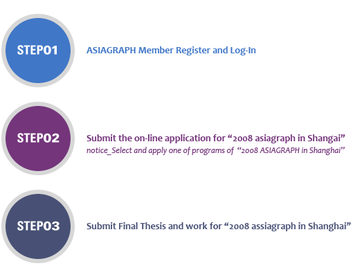 ASIAGRAPH would like you to be a online member of ASIAGRAPH before participating in "2008 ASIAGRAPH in Shanghai". The deadline to submit your works is up to May 10 by sending E-mail / upload our website or the data CD / DVD to us. Please check carefully and apply by the following steps.